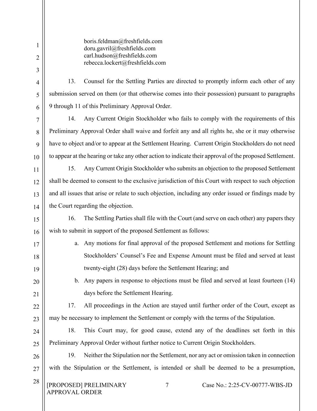 [PROPOSED] PRELIMINARY APPROVAL ORDER 7 Case No.: 2:25-CV-00777-WBS-JD 1 2 3 4 5 6 7 8 9 10 11 12 13 14 15 16 17 18 19 20 21 22 23 24 25 26 27 28 boris.feldman@freshfields.com doru.gavril@freshfields.com carl.hudson@freshfields.com rebecca.lockert@freshfields.com 13. Counsel for the Settling Parties are directed to promptly inform each other of any submission served on them (or that otherwise comes into their possession) pursuant to paragraphs 9 through 11 of this Preliminary Approval Order. 14. Any Current Origin Stockholder who fails to comply with the requirements of this Preliminary Approval Order shall waive and forfeit any and all rights he, she or it may otherwise have to object and/or to appear at the Settlement Hearing. Current Origin Stockholders do not need to appear at the hearing or take any other action to indicate their approval of the proposed Settlement. 15. Any Current Origin Stockholder who submits an objection to the proposed Settlement shall be deemed to consent to the exclusive jurisdiction of this Court with respect to such objection and all issues that arise or relate to such objection, including any order issued or findings made by the Court regarding the objection. 16. The Settling Parties shall file with the Court (and serve on each other) any papers they wish to submit in support of the proposed Settlement as follows: a. Any motions for final approval of the proposed Settlement and motions for Settling Stockholders’ Counsel’s Fee and Expense Amount must be filed and served at least twenty-eight (28) days before the Settlement Hearing; and b. Any papers in response to objections must be filed and served at least fourteen (14) days before the Settlement Hearing. 17. All proceedings in the Action are stayed until further order of the Court, except as may be necessary to implement the Settlement or comply with the terms of the Stipulation. 18. This Court may, for good cause, extend any of the deadlines set forth in this Preliminary Approval Order without further notice to Current Origin Stockholders. 19. Neither the Stipulation nor the Settlement, nor any act or omission taken in connection with the Stipulation or the Settlement, is intended or shall be deemed to be a presumption,