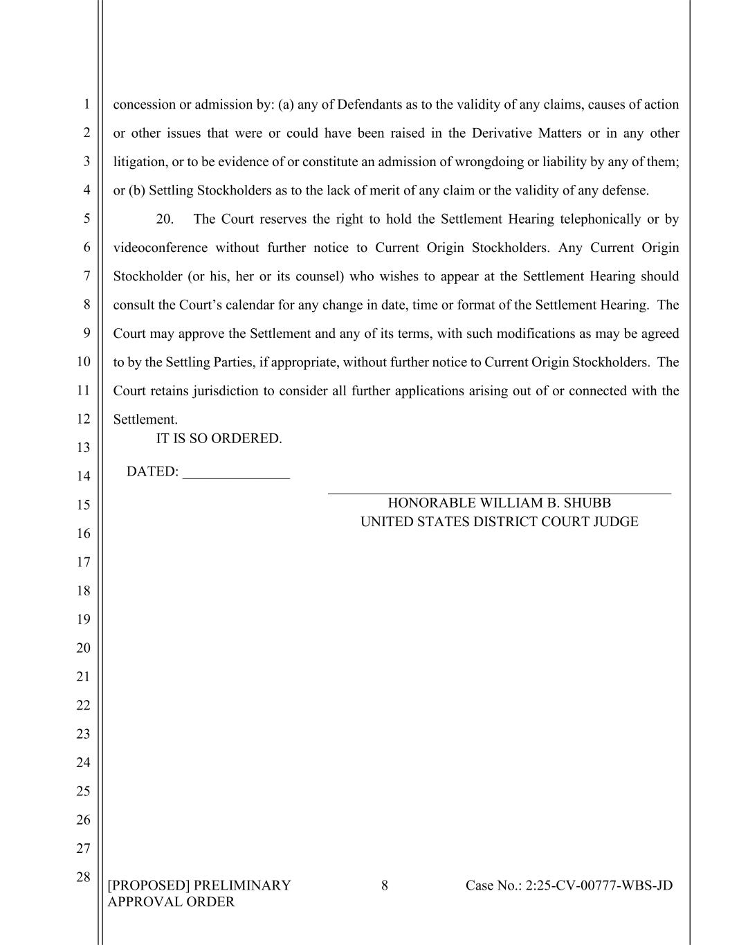 [PROPOSED] PRELIMINARY APPROVAL ORDER 8 Case No.: 2:25-CV-00777-WBS-JD 1 2 3 4 5 6 7 8 9 10 11 12 13 14 15 16 17 18 19 20 21 22 23 24 25 26 27 28 concession or admission by: (a) any of Defendants as to the validity of any claims, causes of action or other issues that were or could have been raised in the Derivative Matters or in any other litigation, or to be evidence of or constitute an admission of wrongdoing or liability by any of them; or (b) Settling Stockholders as to the lack of merit of any claim or the validity of any defense. 20. The Court reserves the right to hold the Settlement Hearing telephonically or by videoconference without further notice to Current Origin Stockholders. Any Current Origin Stockholder (or his, her or its counsel) who wishes to appear at the Settlement Hearing should consult the Court’s calendar for any change in date, time or format of the Settlement Hearing. The Court may approve the Settlement and any of its terms, with such modifications as may be agreed to by the Settling Parties, if appropriate, without further notice to Current Origin Stockholders. The Court retains jurisdiction to consider all further applications arising out of or connected with the Settlement. IT IS SO ORDERED. DATED: _______________ HONORABLE WILLIAM B. SHUBB UNITED STATES DISTRICT COURT JUDGE