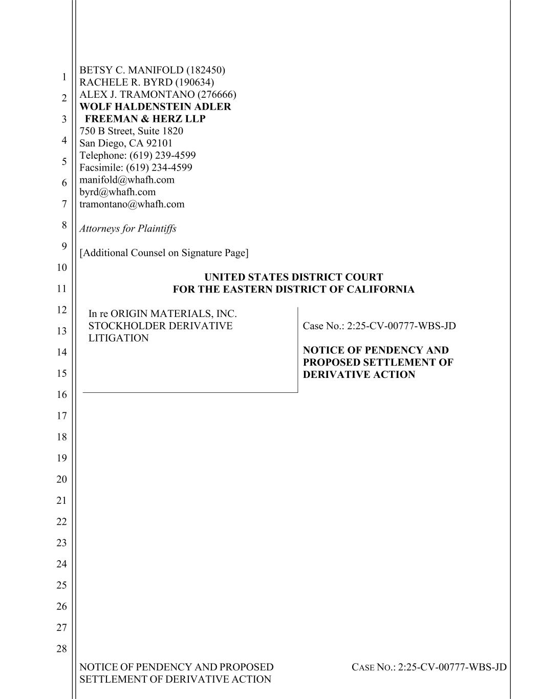 NOTICE OF PENDENCY AND PROPOSED SETTLEMENT OF DERIVATIVE ACTION CASE NO.: 2:25-CV-00777-WBS-JD 1 2 3 4 5 6 7 8 9 10 11 12 13 14 15 16 17 18 19 20 21 22 23 24 25 26 27 28 BETSY C. MANIFOLD (182450) RACHELE R. BYRD (190634) ALEX J. TRAMONTANO (276666) WOLF HALDENSTEIN ADLER FREEMAN & HERZ LLP 750 B Street, Suite 1820 San Diego, CA 92101 Telephone: (619) 239-4599 Facsimile: (619) 234-4599 manifold@whafh.com byrd@whafh.com tramontano@whafh.com Attorneys for Plaintiffs [Additional Counsel on Signature Page] UNITED STATES DISTRICT COURT FOR THE EASTERN DISTRICT OF CALIFORNIA In re ORIGIN MATERIALS, INC. STOCKHOLDER DERIVATIVE LITIGATION Case No.: 2:25-CV-00777-WBS-JD NOTICE OF PENDENCY AND PROPOSED SETTLEMENT OF DERIVATIVE ACTION