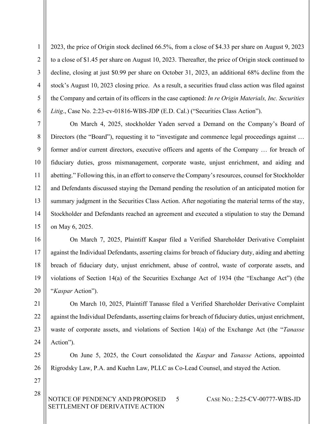 NOTICE OF PENDENCY AND PROPOSED SETTLEMENT OF DERIVATIVE ACTION 5 CASE NO.: 2:25-CV-00777-WBS-JD 1 2 3 4 5 6 7 8 9 10 11 12 13 14 15 16 17 18 19 20 21 22 23 24 25 26 27 28 2023, the price of Origin stock declined 66.5%, from a close of $4.33 per share on August 9, 2023 to a close of $1.45 per share on August 10, 2023. Thereafter, the price of Origin stock continued to decline, closing at just $0.99 per share on October 31, 2023, an additional 68% decline from the stock’s August 10, 2023 closing price. As a result, a securities fraud class action was filed against the Company and certain of its officers in the case captioned: In re Origin Materials, Inc. Securities Litig., Case No. 2:23-cv-01816-WBS-JDP (E.D. Cal.) (“Securities Class Action”). On March 4, 2025, stockholder Yaden served a Demand on the Company’s Board of Directors (the “Board”), requesting it to “investigate and commence legal proceedings against … former and/or current directors, executive officers and agents of the Company … for breach of fiduciary duties, gross mismanagement, corporate waste, unjust enrichment, and aiding and abetting.” Following this, in an effort to conserve the Company’s resources, counsel for Stockholder and Defendants discussed staying the Demand pending the resolution of an anticipated motion for summary judgment in the Securities Class Action. After negotiating the material terms of the stay, Stockholder and Defendants reached an agreement and executed a stipulation to stay the Demand on May 6, 2025. On March 7, 2025, Plaintiff Kaspar filed a Verified Shareholder Derivative Complaint against the Individual Defendants, asserting claims for breach of fiduciary duty, aiding and abetting breach of fiduciary duty, unjust enrichment, abuse of control, waste of corporate assets, and violations of Section 14(a) of the Securities Exchange Act of 1934 (the “Exchange Act”) (the “Kaspar Action”). On March 10, 2025, Plaintiff Tanasse filed a Verified Shareholder Derivative Complaint against the Individual Defendants, asserting claims for breach of fiduciary duties, unjust enrichment, waste of corporate assets, and violations of Section 14(a) of the Exchange Act (the “Tanasse Action”). On June 5, 2025, the Court consolidated the Kaspar and Tanasse Actions, appointed Rigrodsky Law, P.A. and Kuehn Law, PLLC as Co-Lead Counsel, and stayed the Action.