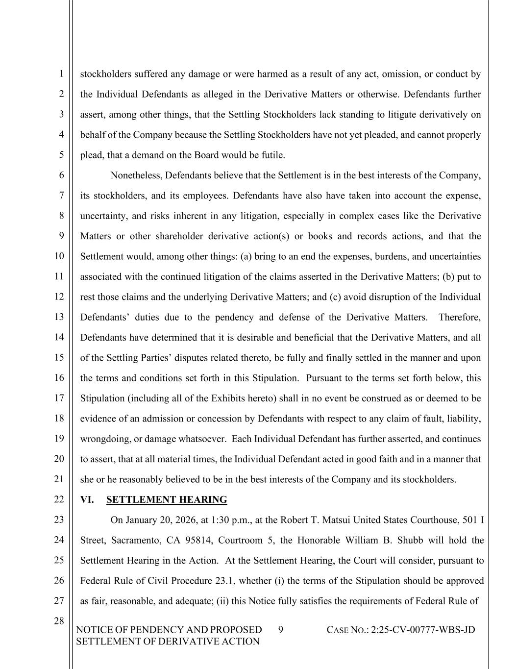 NOTICE OF PENDENCY AND PROPOSED SETTLEMENT OF DERIVATIVE ACTION 9 CASE NO.: 2:25-CV-00777-WBS-JD 1 2 3 4 5 6 7 8 9 10 11 12 13 14 15 16 17 18 19 20 21 22 23 24 25 26 27 28 stockholders suffered any damage or were harmed as a result of any act, omission, or conduct by the Individual Defendants as alleged in the Derivative Matters or otherwise. Defendants further assert, among other things, that the Settling Stockholders lack standing to litigate derivatively on behalf of the Company because the Settling Stockholders have not yet pleaded, and cannot properly plead, that a demand on the Board would be futile. Nonetheless, Defendants believe that the Settlement is in the best interests of the Company, its stockholders, and its employees. Defendants have also have taken into account the expense, uncertainty, and risks inherent in any litigation, especially in complex cases like the Derivative Matters or other shareholder derivative action(s) or books and records actions, and that the Settlement would, among other things: (a) bring to an end the expenses, burdens, and uncertainties associated with the continued litigation of the claims asserted in the Derivative Matters; (b) put to rest those claims and the underlying Derivative Matters; and (c) avoid disruption of the Individual Defendants’ duties due to the pendency and defense of the Derivative Matters. Therefore, Defendants have determined that it is desirable and beneficial that the Derivative Matters, and all of the Settling Parties’ disputes related thereto, be fully and finally settled in the manner and upon the terms and conditions set forth in this Stipulation. Pursuant to the terms set forth below, this Stipulation (including all of the Exhibits hereto) shall in no event be construed as or deemed to be evidence of an admission or concession by Defendants with respect to any claim of fault, liability, wrongdoing, or damage whatsoever. Each Individual Defendant has further asserted, and continues to assert, that at all material times, the Individual Defendant acted in good faith and in a manner that she or he reasonably believed to be in the best interests of the Company and its stockholders. VI. SETTLEMENT HEARING On January 20, 2026, at 1:30 p.m., at the Robert T. Matsui United States Courthouse, 501 I Street, Sacramento, CA 95814, Courtroom 5, the Honorable William B. Shubb will hold the Settlement Hearing in the Action. At the Settlement Hearing, the Court will consider, pursuant to Federal Rule of Civil Procedure 23.1, whether (i) the terms of the Stipulation should be approved as fair, reasonable, and adequate; (ii) this Notice fully satisfies the requirements of Federal Rule of