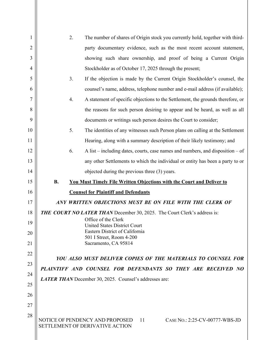 NOTICE OF PENDENCY AND PROPOSED SETTLEMENT OF DERIVATIVE ACTION 11 CASE NO.: 2:25-CV-00777-WBS-JD 1 2 3 4 5 6 7 8 9 10 11 12 13 14 15 16 17 18 19 20 21 22 23 24 25 26 27 28 2. The number of shares of Origin stock you currently hold, together with third- party documentary evidence, such as the most recent account statement, showing such share ownership, and proof of being a Current Origin Stockholder as of October 17, 2025 through the present; 3. If the objection is made by the Current Origin Stockholder’s counsel, the counsel’s name, address, telephone number and e-mail address (if available); 4. A statement of specific objections to the Settlement, the grounds therefore, or the reasons for such person desiring to appear and be heard, as well as all documents or writings such person desires the Court to consider; 5. The identities of any witnesses such Person plans on calling at the Settlement Hearing, along with a summary description of their likely testimony; and 6. A list – including dates, courts, case names and numbers, and disposition – of any other Settlements to which the individual or entity has been a party to or objected during the previous three (3) years. B. You Must Timely File Written Objections with the Court and Deliver to Counsel for Plaintiff and Defendants ANY WRITTEN OBJECTIONS MUST BE ON FILE WITH THE CLERK OF THE COURT NO LATER THAN December 30, 2025. The Court Clerk’s address is: Office of the Clerk United States District Court Eastern District of California 501 I Street, Room 4-200 Sacramento, CA 95814 YOU ALSO MUST DELIVER COPIES OF THE MATERIALS TO COUNSEL FOR PLAINTIFF AND COUNSEL FOR DEFENDANTS SO THEY ARE RECEIVED NO LATER THAN December 30, 2025. Counsel’s addresses are: