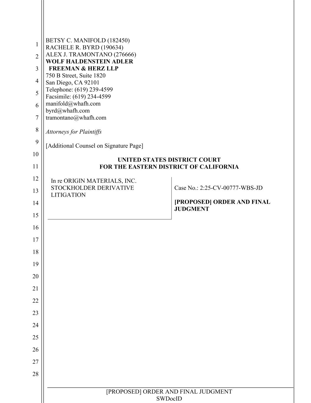 [PROPOSED] ORDER AND FINAL JUDGMENT SWDocID 1 2 3 4 5 6 7 8 9 10 11 12 13 14 15 16 17 18 19 20 21 22 23 24 25 26 27 28 BETSY C. MANIFOLD (182450) RACHELE R. BYRD (190634) ALEX J. TRAMONTANO (276666) WOLF HALDENSTEIN ADLER FREEMAN & HERZ LLP 750 B Street, Suite 1820 San Diego, CA 92101 Telephone: (619) 239-4599 Facsimile: (619) 234-4599 manifold@whafh.com byrd@whafh.com tramontano@whafh.com Attorneys for Plaintiffs [Additional Counsel on Signature Page] UNITED STATES DISTRICT COURT FOR THE EASTERN DISTRICT OF CALIFORNIA In re ORIGIN MATERIALS, INC. STOCKHOLDER DERIVATIVE LITIGATION Case No.: 2:25-CV-00777-WBS-JD [PROPOSED] ORDER AND FINAL JUDGMENT