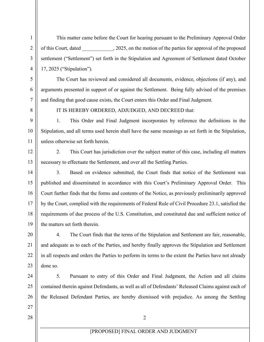 2 [PROPOSED] FINAL ORDER AND JUDGMENT 1 2 3 4 5 6 7 8 9 10 11 12 13 14 15 16 17 18 19 20 21 22 23 24 25 26 27 28 This matter came before the Court for hearing pursuant to the Preliminary Approval Order of this Court, dated ____________, 2025, on the motion of the parties for approval of the proposed settlement (“Settlement”) set forth in the Stipulation and Agreement of Settlement dated October 17, 2025 (“Stipulation”). The Court has reviewed and considered all documents, evidence, objections (if any), and arguments presented in support of or against the Settlement. Being fully advised of the premises and finding that good cause exists, the Court enters this Order and Final Judgment. IT IS HEREBY ORDERED, ADJUDGED, AND DECREED that: 1. This Order and Final Judgment incorporates by reference the definitions in the Stipulation, and all terms used herein shall have the same meanings as set forth in the Stipulation, unless otherwise set forth herein. 2. This Court has jurisdiction over the subject matter of this case, including all matters necessary to effectuate the Settlement, and over all the Settling Parties. 3. Based on evidence submitted, the Court finds that notice of the Settlement was published and disseminated in accordance with this Court’s Preliminary Approval Order. This Court further finds that the forms and contents of the Notice, as previously preliminarily approved by the Court, complied with the requirements of Federal Rule of Civil Procedure 23.1, satisfied the requirements of due process of the U.S. Constitution, and constituted due and sufficient notice of the matters set forth therein. 4. The Court finds that the terms of the Stipulation and Settlement are fair, reasonable, and adequate as to each of the Parties, and hereby finally approves the Stipulation and Settlement in all respects and orders the Parties to perform its terms to the extent the Parties have not already done so. 5. Pursuant to entry of this Order and Final Judgment, the Action and all claims contained therein against Defendants, as well as all of Defendants’ Released Claims against each of the Released Defendant Parties, are hereby dismissed with prejudice. As among the Settling
