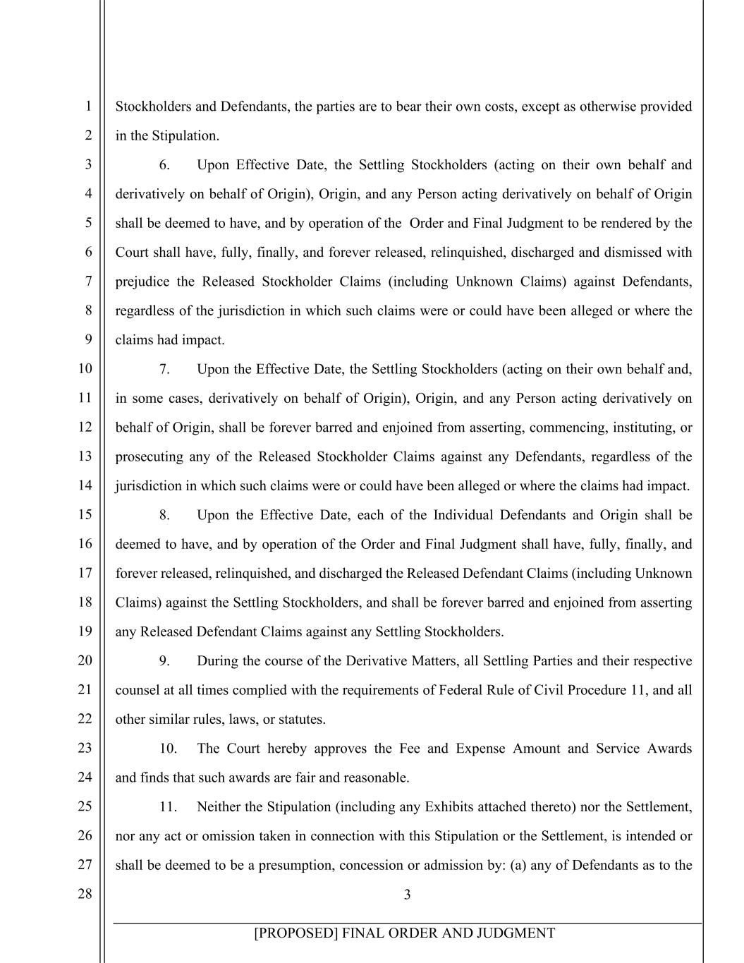 3 [PROPOSED] FINAL ORDER AND JUDGMENT 1 2 3 4 5 6 7 8 9 10 11 12 13 14 15 16 17 18 19 20 21 22 23 24 25 26 27 28 Stockholders and Defendants, the parties are to bear their own costs, except as otherwise provided in the Stipulation. 6. Upon Effective Date, the Settling Stockholders (acting on their own behalf and derivatively on behalf of Origin), Origin, and any Person acting derivatively on behalf of Origin shall be deemed to have, and by operation of the Order and Final Judgment to be rendered by the Court shall have, fully, finally, and forever released, relinquished, discharged and dismissed with prejudice the Released Stockholder Claims (including Unknown Claims) against Defendants, regardless of the jurisdiction in which such claims were or could have been alleged or where the claims had impact. 7. Upon the Effective Date, the Settling Stockholders (acting on their own behalf and, in some cases, derivatively on behalf of Origin), Origin, and any Person acting derivatively on behalf of Origin, shall be forever barred and enjoined from asserting, commencing, instituting, or prosecuting any of the Released Stockholder Claims against any Defendants, regardless of the jurisdiction in which such claims were or could have been alleged or where the claims had impact. 8. Upon the Effective Date, each of the Individual Defendants and Origin shall be deemed to have, and by operation of the Order and Final Judgment shall have, fully, finally, and forever released, relinquished, and discharged the Released Defendant Claims (including Unknown Claims) against the Settling Stockholders, and shall be forever barred and enjoined from asserting any Released Defendant Claims against any Settling Stockholders. 9. During the course of the Derivative Matters, all Settling Parties and their respective counsel at all times complied with the requirements of Federal Rule of Civil Procedure 11, and all other similar rules, laws, or statutes. 10. The Court hereby approves the Fee and Expense Amount and Service Awards and finds that such awards are fair and reasonable. 11. Neither the Stipulation (including any Exhibits attached thereto) nor the Settlement, nor any act or omission taken in connection with this Stipulation or the Settlement, is intended or shall be deemed to be a presumption, concession or admission by: (a) any of Defendants as to the