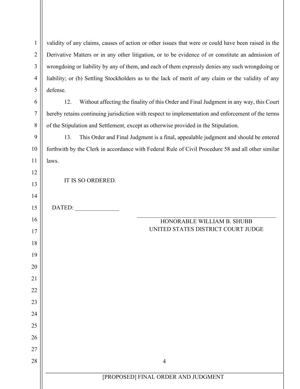 4 [PROPOSED] FINAL ORDER AND JUDGMENT 1 2 3 4 5 6 7 8 9 10 11 12 13 14 15 16 17 18 19 20 21 22 23 24 25 26 27 28 validity of any claims, causes of action or other issues that were or could have been raised in the Derivative Matters or in any other litigation, or to be evidence of or constitute an admission of wrongdoing or liability by any of them, and each of them expressly denies any such wrongdoing or liability; or (b) Settling Stockholders as to the lack of merit of any claim or the validity of any defense. 12. Without affecting the finality of this Order and Final Judgment in any way, this Court hereby retains continuing jurisdiction with respect to implementation and enforcement of the terms of the Stipulation and Settlement, except as otherwise provided in the Stipulation. 13. This Order and Final Judgment is a final, appealable judgment and should be entered forthwith by the Clerk in accordance with Federal Rule of Civil Procedure 58 and all other similar laws. IT IS SO ORDERED. DATED: _______________ HONORABLE WILLIAM B. SHUBB UNITED STATES DISTRICT COURT JUDGE